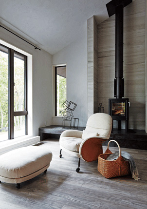 厳しい冬にも暖かく過ごせるよう、リビングにはインテリア性と機能性を兼ね備えた薪ストーブを設置。また、ゆったりと體を預けられるソファやお気に入りのオブジェをディスプレイできる飾り棚などで、親しい友人や家族が集う「※ヒュッゲ」な時間を演出しています。