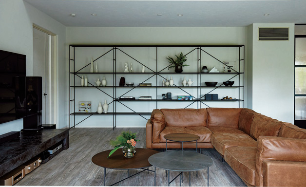 內裝はグレーの床材と調濕性に優れた白い火山灰の塗り壁でシンプルに。木や石、革を使った家具や、ソフトファニシング(カーテンやカバーリング)でアクセントをつけ、アレンジを可能にしています。