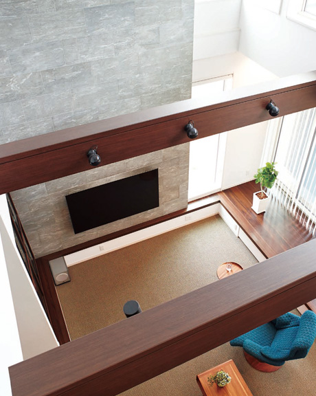 Mさまご夫妻が希望されたのは、子ども達(dá)がのびのび走り回れる広いLDK。リビングは吹き抜けとロースタイルを採(cǎi)用することで、天井高6mのダイナミックな空間に。大きな開(kāi)口部から光が差し込み、自然石調(diào)のアクセントタイルとともに、家族の集いの場(chǎng)を穏やかに演出します。吹き抜けを介して2階のファミリーリビングとつながり、子ども達(dá)がどこで遊んでいても気配を感じられる住まいになりました。