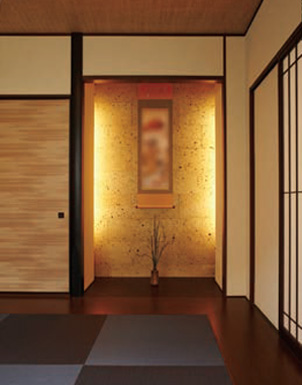 陰影に富んだ大谷石を床の間に張った、モダンな和室