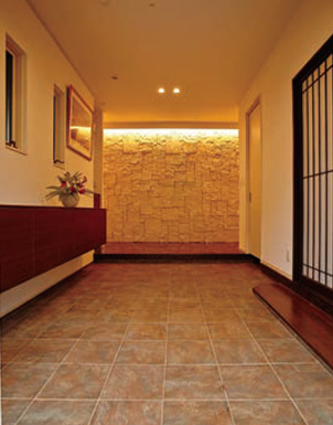 自然石調(diào)のタイルで華やかに飾った來(lái)客用の玄関ホール