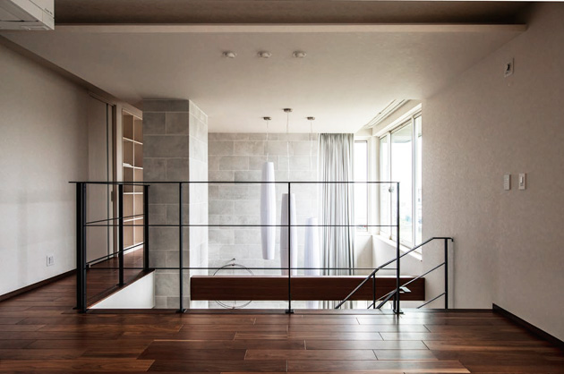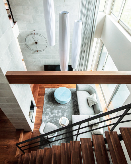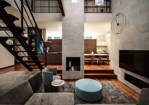 外観と同じアクセントタイルを玄関ホールにもあしらったほか、ロースタイルのリビングの壁もグレーのタイルで演出。1?2階連続の窓を備えた開放的な吹き抜け空間ですが、2階から吊るした長いカーテンを閉じれば、包み込まれるような心地良さを感じられます。ソファに腰かけて視線を上げると、吹き抜けを通して2階のファミリーリビングにいる家族とコミュニケーションを取ることも可能です。