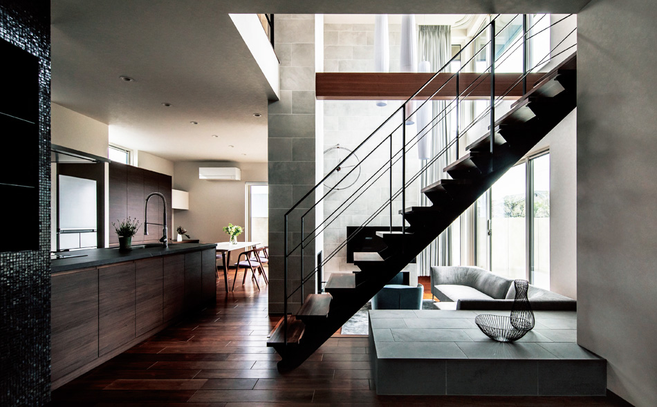 オブジェのようなスケルトン階段が存在感を放つLDK。明るさと暗さのコントラストが印象的な空間をつくり上げています