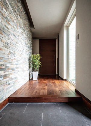 玄関ホールには外観と同じタイルをあしらい、內と外の一體感を演出