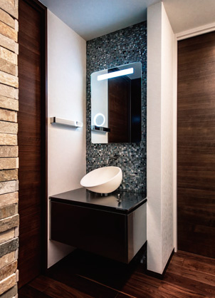 「おもてなし洗面」のモザイクタイルや凝ったデザインのボウルは、トーヨーキッチンスタイルでセレクト