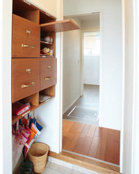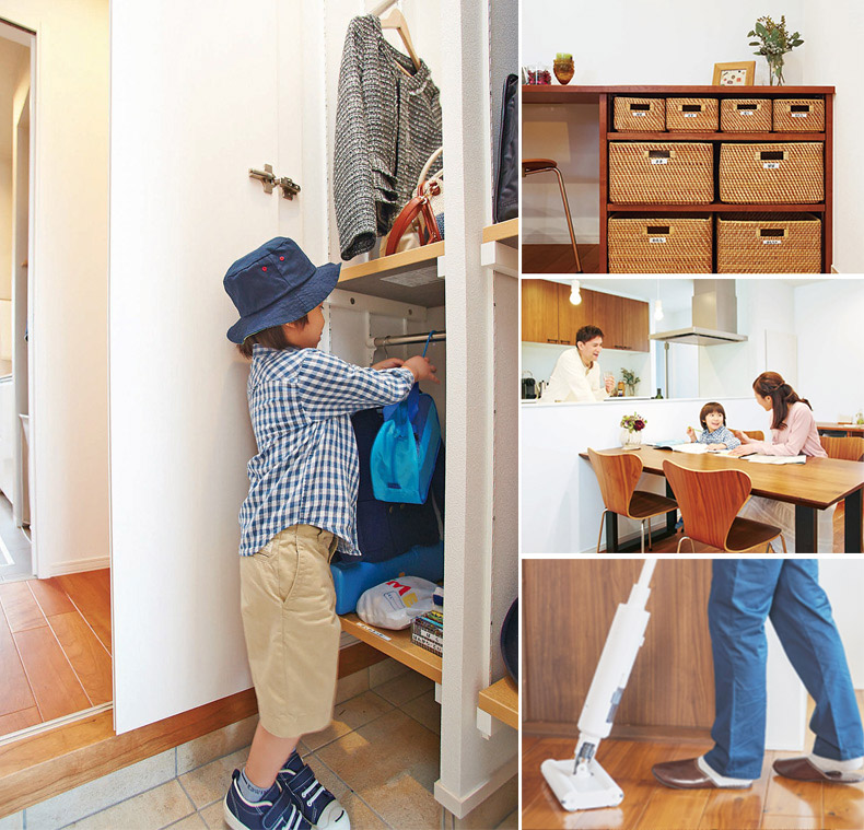 ポイントは、子どもを含めた家族の一人ひとりが、自分の身の回りの家事を自分でできるようにすることです。例えば、外から帰ってきたら上著をハンガーにかけ、鞄を所定の位置にしまい、手洗いや著替えをしてからリビングに向かう“家事シェア動線”。リビングに家族の持ち物が散らかるのを防いで、「散らかったものを片づける」という「名もなき家事」を発生させません。