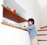 畳んだ洗濯物など、後で2階に持って上がるもので階段はふさがりがち。階段の橫に一時置きコーナーがあれば一件落著です。