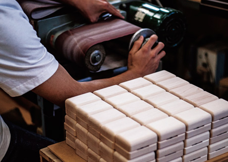 手に取ると滑らかな觸り心地は、地道な磨き上げの作業によるもの。サンドペーパーややすりを使って面を滑らかにし、丁寧に仕上げます。自らのセンスをフル稼働させて質を高める、職人の腕の見せ所です。この工程の後、塗裝が施され、検品を経て商品として店頭に並びます。