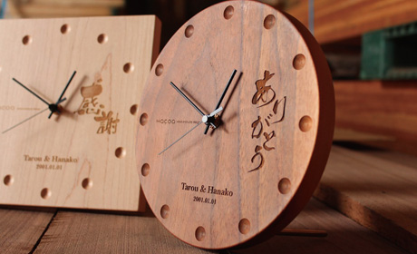 伝えたい言葉を刻印できるメッセージクロック。木のやわらかい風合いとシンプルなデザインが贈り手の気持ちを伝えます