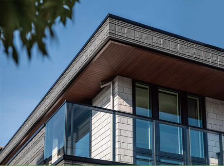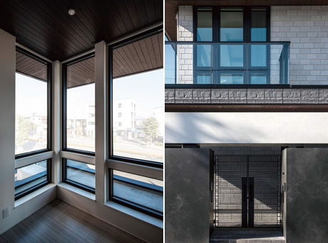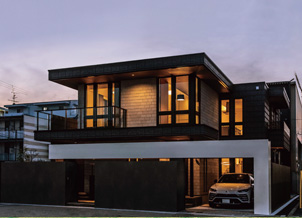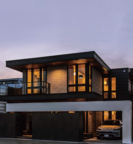 いずれも個性豊かな二世帯の暮らしを象徴する外観は、深い軒とL字型のハーフゲートが印象的なデザインです。屋根とゲートの成す水平ラインや深彫の外壁が堂々とした印象を與え、住宅地の中に溶け込みながらも、その存在を主張します。