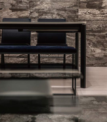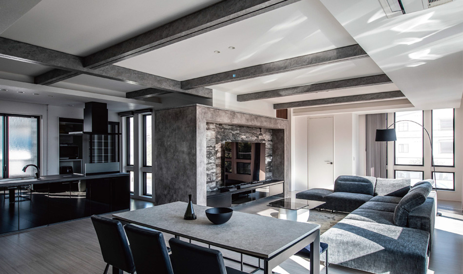 聖智さんがイメージしたのは、モノトーンでコーディネートしたクールなインテリア。LDKの中心に存在感のあるテレビボードを造作し、グレイッシュな塗り仕上げと大判の輸入タイルでインパクトをもたせました。グレーのソファや大理石の天板が美しいダイニングテーブルとともに、ラグジュアリーなくつろぎの場をつくっています。キッチンも黒で統一感を演出。鏡面扉が床材の木目を映し、広さと開放感をより際立たせています。