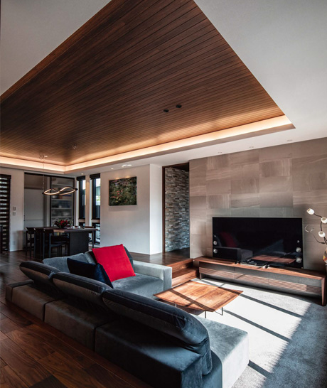 清子さんが暮らす1階はリビングの床を下げてロースタイルに。天井には間接照明を取り入れ、ホテルライクな天井高3m8㎝の空間を実現