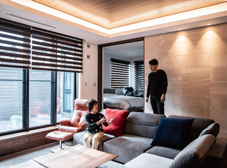 一方、1階の清子さんの住空間は、木のぬくもりを意識したホテルのようなインテリアが特徴。ロースタイルのリビングは3m8㎝の天井高をもたせ、間接照明を組み入れています。